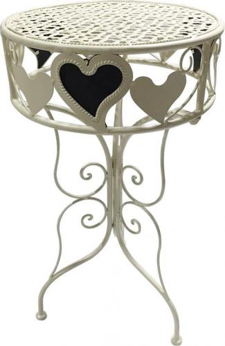 Vyrobený z pevného kovu s jemnou patinovanou bielou povrchovou úpravou, stojan vyniká svojím prepracovaným dizajnom. Vrchná doska má dekoratívne perforácie, ktoré pridávajú na vintage šarme, zatiaľ čo bočné časti zdobia srdiečkové ornamenty v rôznych prevedeniach.