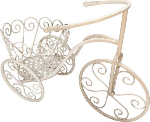 Vyrobený z odolného kovu, stojan disponuje jemne prepracovanými ornamentmi a bielym povrchom s patinou, čo mu dodáva romantický a starožitný vzhľad. Elegantné špirálové detaily na kolesách a košíku podčiarkujú jeho jedinečný dizajn.