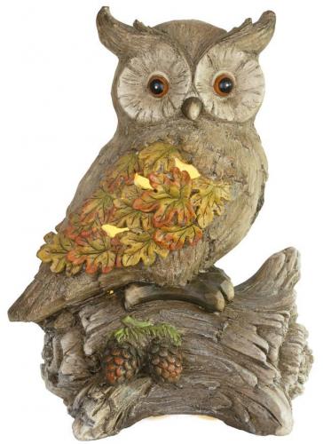 Dekorácia MagicHome Nature, Sova sedí na kmeni, 9 LED, 3xAAA, keramika, 31x21x42 cm