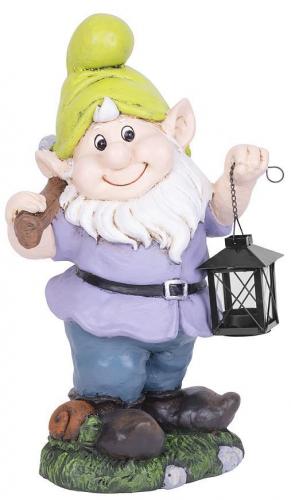 Dekorácia MagicHome, Trpaslík s lampášom vo fialovom svetríku, keramika, 25x20,5x45,5 cm
