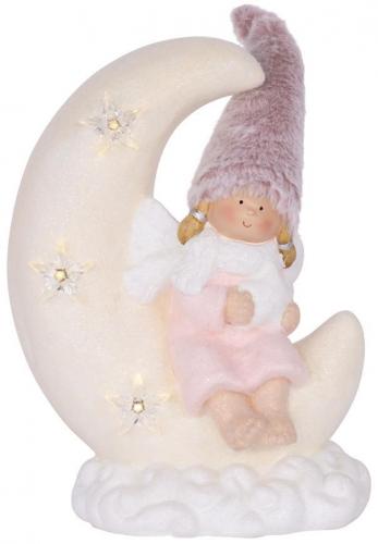 Krásna dekorácia MagicHome Dievčatko sediac na mesiačiku skrášli Váš domov počas vianočného obdobia. Má krásnu huňatú čiapku z textilu. Dekorácia svieti a batérie sú súčasťou balenia. Materiál: keramika. Počet LED: 3, farba LED: teplá biela. Rozmery: 26,5x16x35 cm.
