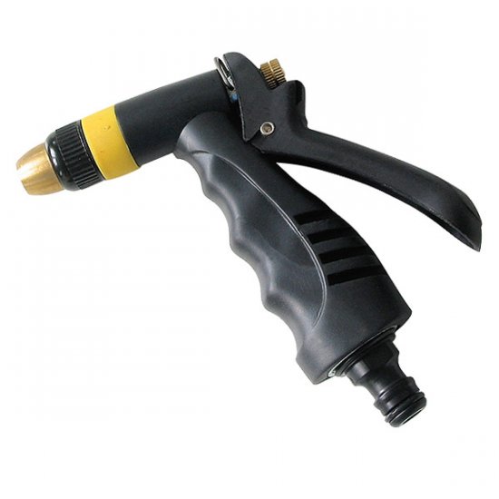 plastovo-mosadzný, ergonomická pogumovaná rukoväť, nastaviteľná tryska