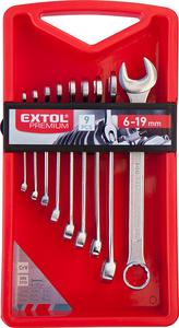 EXTOL PREMIUM kľúče očkoploché, sada 9ks 6-7-8-10-12-13-14-15-17-19mm leštená hlava kľúčov, telo kované z jedného kusa z chróm-vanádiovej ocele, balené v plastovej kazete s možnosťou zavesenia na stenu
