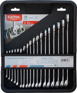 EXTOL PREMIUM kľúče očkoploché, sada 18ks 6-7-8-9-10-11-12-13-14-15-16-17-18-19-20-21-22-24mm leštená hlava kľúčov, telo kované z jedného kusa z chróm-vanádiovej ocele, balené v plastovej kazete s možnosťou zavesenia na stenu