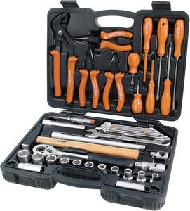 Račňa 1/2 ", kľúče nástrčné 8-24mm, kľúče otvorené / očkové 10-19mm, 5xšroubovák, 2xel. Skrutkovač, skúšačka, kliešte komb, SIKO, priame, štípacie, kladivo 300g, zapaľovacia sviečka 2ks, univerzálna spojka.