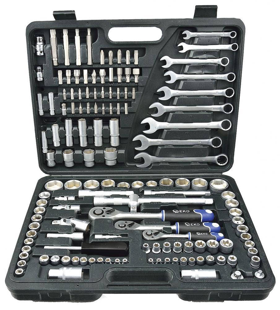 Gola sada z renomovanej značky GEKO pozostáva zo 138 prvkov. V ňom nájdete súpravu plochých kĺbových kľúčov, hlavic a skrutkovacích hrotov a račňu 1/2 ", 3/8" a 1/4 "s 45 zubami.