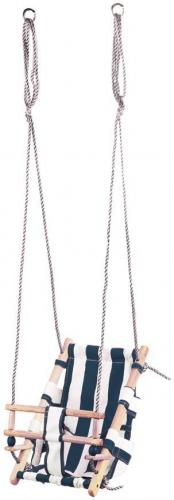 Plátená detská hojdačka modrej farby je prispôsobená pre tých najmenších. Vďaka svojmu polo-ležatému tvaru do nej jednoducho dieťa uložíte. V prednej časti hojdačky sa nachádza drevená zábrana voči vypadnutiu. Drevené časti sa pre spevnenie celej hojdačky nachádzajú aj po bokoch sedacej časti. Na bokoch hojdačky sú umiestnené laná s priemerom 10 mm a dĺžkou 2 m. Potrebnú dĺžku lán si viete manuálne nastaviť a zauzliť. Na predom našrubované háky vložíte kovové oká na koncoch lán. Po tomto kroku je už možné bezpečne sa hojdať. Nosnosť je 70 kg a rozmery sú 36 x 24 x 45 cm.