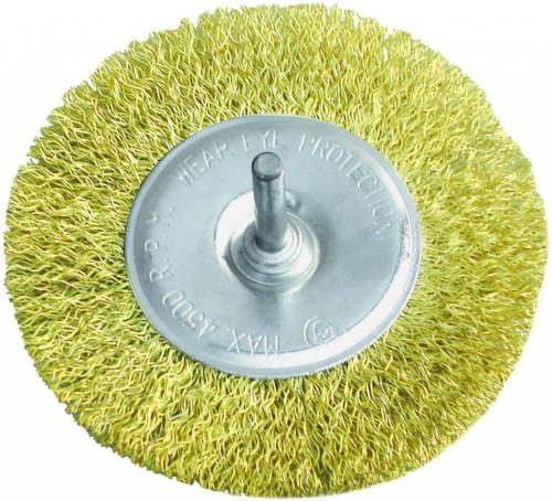 Mosadzný okružný kartáč 100 mm so stopkou. Ideálny na renovačné práce, čistenie kovových povrchov, odstraňovanie starých farieb, lakov, hrdze, otrepov atď.