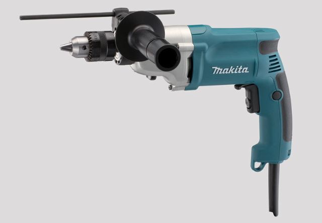 Vŕtací skrutkovač so skľučovadlom s ozubeným vencom, príkonom 720W, hliníkové teleso dvojstupňovej prevodovky, regulovanie otáčok nastavovacím kolieskom, vhodné pre silové vŕtanie, alebo náročné skrutkovanie, klzná spojka