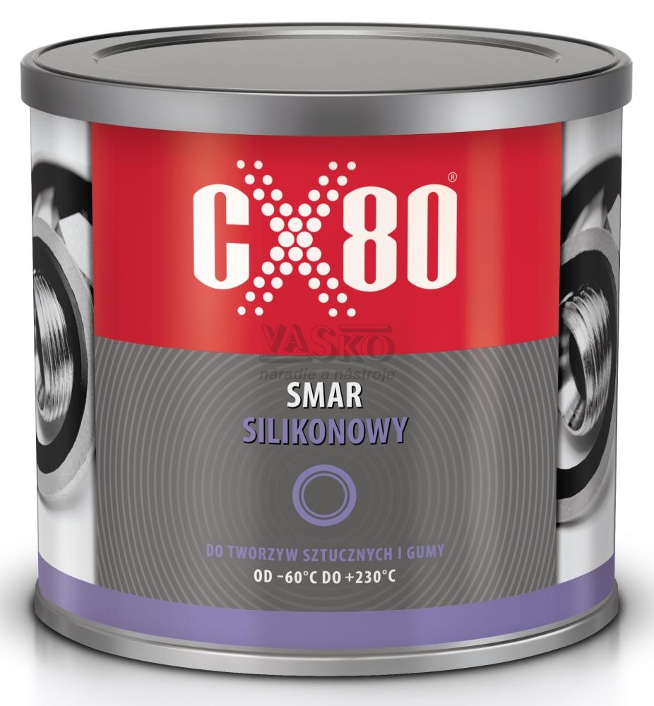 Bezfarebné vysoko viskózne mazivo. Na povrchu vytvára mimoriadne odolný jemný povlak, ktorý maximálne znižuje trenie, čím predlžuje životnosť zariadenia. CX80 silikónové mazivo je vhodné hlavne na miesta, kde sú v kontakte plochy vyrobené z plastu, kovu, keramiky, gumy a ďalších materiálov.