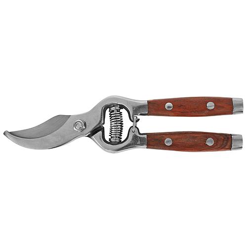 Nožnice záhradné 200 mm. Čepeľ z nerezovej ocele, kovaným povrchom, zrkadlovo leštené. Rukoväť z červeného dreva s jemným leštením.