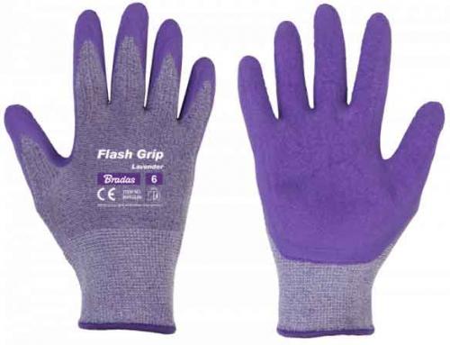 Ochranné rukavice FLASH GRIP LAVENDER, veľkosť 8 latex Rukavice z pleteného polyesteru a spandexu - steh 13. Prsty potiahnuté penovým latexom. Odolné proti prerezaniu a roztrhnutiu Veľkosť: 8