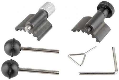 Profesionálny nástroj na aretáciu rozvodových kladiek . Súprava umožňuje znehybnenie rozvodov v servisnej polohe pri výmene rozvodového remeňa. Špeciálny tvar zámkov umožňuje presné nastavenie kontrolných bodov zapaľovania. ZLOŽENIE SETU: 2x zámok kľukového hriadeľa 2x zámok vačkového hriadeľa poistný kolík napínača Súprava je určená na výmenu rozvodového remeňa v špecializovaných autoservisoch. Umožňuje znehybnenie ozubených kolies v servisnej polohe. Vďaka svojmu tvaru umožňuje presné nastavenie kontrolných bodov zapaľovania. 4 zámky zamykajú ozubené koleso a kľukový hriadeľ a kolík vedľa napínača remeňa. Vhodné pre motory: 3 a 4 valcové 1,2; 1,4; 1,9 TDI a 2,0 SDI a TDI v autách VW, Seat, Ford, Audi a Škoda.