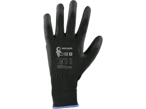 Pletené bezešvé polyesterové rukavice, s tenkou vrstvou polyuretanu v dlani a na prstech a pružnou manžetou.