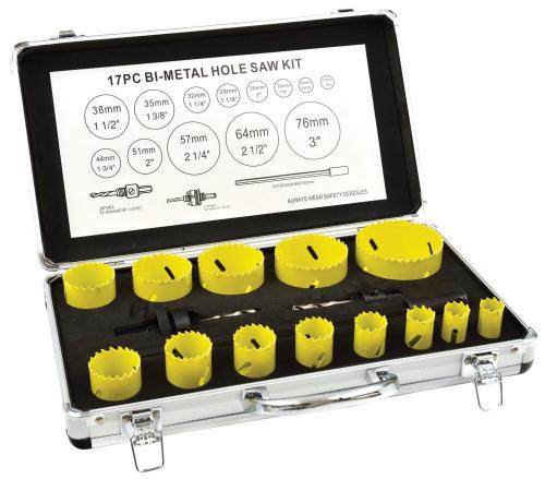 Sada 17ks bimetalových vykružovacích koruniek, 19 - 76 mm, v kufríku. Vhodné na vŕtanie do plastov, dreva a niektorých kovov.