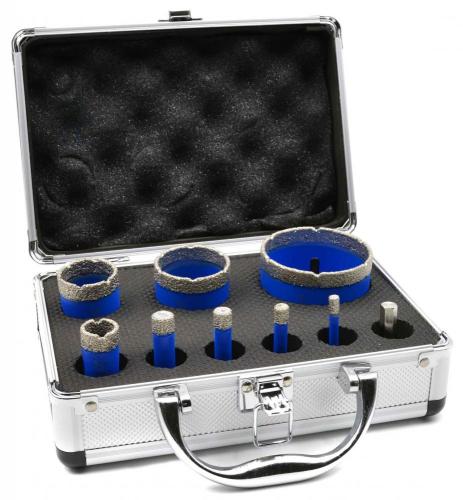 Sada diamantových fréz v kufríku. Diamantové frézy sú prvotriedny nástroj pre obkladačov a kamenárov, ktorý umožňuje veľmi rýchle vytváranie otvorov vo všetkých druhoch obkladačiek, veľmi tvrdých i mäkkých porcelánových kamenín, prírodného kameňa, žuly, mramoru. Je prakticky nemožné ich otupiť. Montáž prebieha priamo na vretene uhlovej brúsky (závit M14) a možnosť suchého chodu znamená vysoký komfort používania. Pri začatí vŕtania nastavte frézu pod určitým uhlom a aplikujte ju na materiál pri plnej rýchlosti až po chvíli ju nastavte kolmo na rovinu platne. Použitie: GRES PRÍRODNÝ KAMEŇ GRANIT MRAMOR Sada obsahuje frézy s veľkosťou: 6 mm 8 mm 10 mm 12 mm 20 mm 35 mm 45 mm 60 mm
