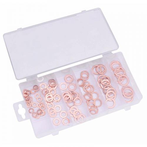 Sada medených podložiek obsahuje: 30 ks - M6, 25 ks - M8, 20 ks - M10, 15 ks - M12, 10 ks - M14, 10 ks - M16.