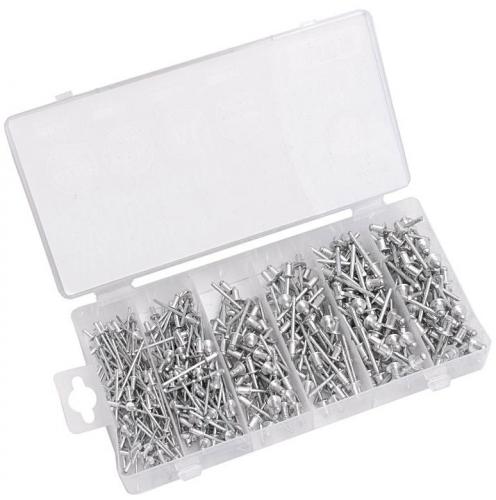 Sada 400 kusov hliníkových nitov s oceľovým čapom. Sada obsahuje štyri najpoužívanejšie veľkosti od 2,4 mm do 4,8 mm.