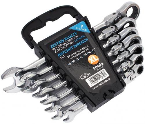 Kĺbové kľúče s račňou. Vyrobené zo silnej chrómovej nástrojovej ocele s vanádom (Cr.V.). Leštené. Sada 6 kľúčov - 8, 10, 12, 13, 14, 17 mm.
