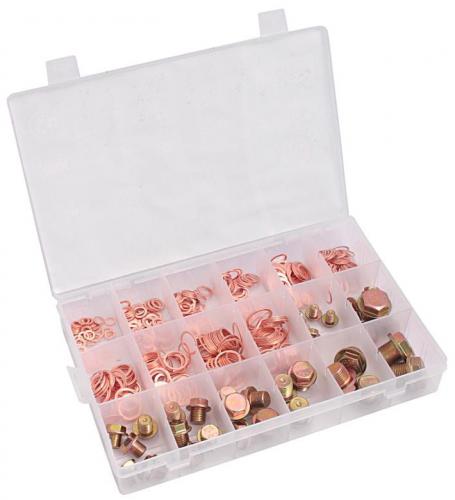 Sada 534 kusov medených podložiek a skrutiek na vypúšťanie oleja. Súprava obsahuje veľkosti od 6 mm do 20 mm.