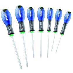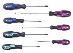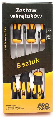 Profesionálna sada skrutkovačov PRO-TECHNIK. Ergonomická dvojzložková rukoväť potiahnutá gumou poskytuje pevné uchopenie a poskytuje pohodlie pri práci. Špička je vyrobená z vysoko kvalitnej ocele S2 a Cr.V. Špička skrutkovača je kalená, silne magnetizovaná, čo uľahčuje prácu na ťažko prístupných miestach. Sada obsahuje: 3x plochý skrutkovač: - 0,6 x 3,5 x 75 mm - 1,0 x 5,5 x 125 mm - 1,2 x 6,5 x 150 mm 3x krížový skrutkovač: - PH0 x 75 mm - PH1 x 100 mm - PH2 x 100 mm
