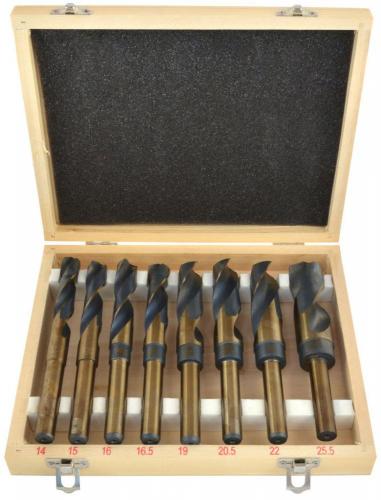 Súprava vrtákov NWK s valcovou stopkou. Vrtáky sú vyrobené výhradne brúsením a tak zaručujú vysokú presnosť. Použitie: na priemyselné použitie, výroba dier do tvrdých zliatin a nelegovaných ocelí, nehrdzavejúcich a kyselinovzdorných ocelí, žiaruvzdorných austenitických ocelí, titánu a zliatin titánu, konštrukčných ocelí, sivej a tvárnej liatiny, zinkového bronzu, hliníkového bronzu, zamaku, grafitu, spekaných práškových kovov, vysokohorských materiálov a do dreva. Vlastnosti výrobku: vyrobené z vysokorýchlostnej ocele HSS s 5% kobaltu zvýšená elasticita a vysoká odolnosť proti oteru a torznému namáhaniu uhol 130 ° zaisťuje presné a rýchle rezanie do obrobku umožňujú vysokú presnosť vŕtania pri vyšších rýchlostiach Technické údaje: Stopka: valcová 1/2 "(vhodné pre skľučovadlá od 13 mm) Veľkosti vrtákov: 14, 15, 16, 16,5, 19, 20,5, 22, 25,5 mm Smer rezu: pravotočivý Povrchová úprava: brúsená
