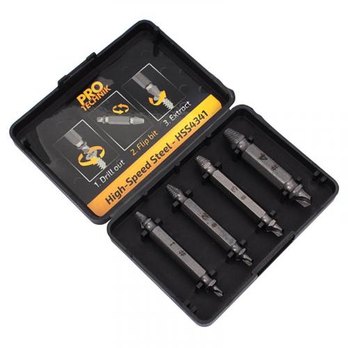 Sada extraktorov pre zalomené skrutky od PRO-TECHNIK +. Profesionálna 5-dielna súprava na odstránenie zalomených skrutiek. Zahŕňa extraktory s najpoužívanejšími priemermi, vďaka čomu je nenahraditeľný v dielni. Vyrobené z vysokorýchlostnej ocele HSS 4241 Priemery extraktorov: 1 - 2 - 3 - 4 1/4" HEX. Zabalené v praktickom kufríku.