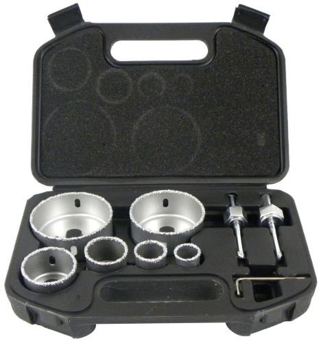 Sada vykružovacích koruniek s wolfrámovým posypom pre sadrokartónové a glazúrové platne.
