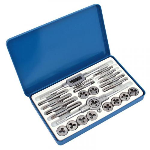 Sada závitnikov a závitových očiek. Vyrobené z kalenej nástrojovej ocele uzavretej v kovovej kazete.