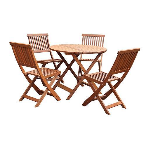 Terasový set je vhodný na umiestnenie do vonkajších priestorov terás, záhrad a podobne. Set pozostáva zo stola a štyroch stoličiek, čím poskytuje možnosť usadenia viacerých ľudí. Set je celodrevený, pokrytý prírodnou ochrannou farbou. Nemusíte sa preto báť poškodenia pred vonkajšími vplyvmi. Set je skvelým prostriedkom pre príjemné posedenie a oddych. Stôl je okrúhleho tvaru a v jeho strede je pripravený otvor pre umiestnenie slnečníka. Vďaka umiestneniu slnečníka bude poskytnutý dostatočne veľký tieň a ochrana pred pálicim slnkom.