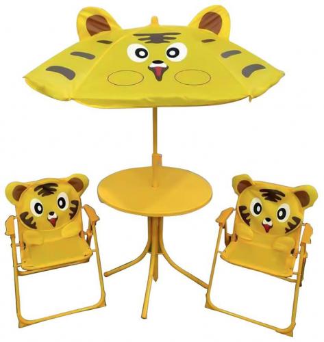 Detský záhradný set Melisenda je vhodný na záhradu, terasu či kempovanie. Pozostáva z 2 stoličiek a 1 stola so slnečníkom. Záhradný set je vyrobený z kovu a textílie a je ľahko zložiteľný. Určené do 30 kg dieťaťa. Farba : žltá s motívom tigra. Doprajte svojim deťom krásne sedenie v prírode.