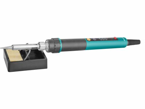 Profesionálna mikroprocesorová hrotová spájkovačka s displejom je určená na mäkké spájkovanie, ktoré vyžaduje presnosť a kontrolu teploty hrotu, najmä pri práci s elektronikou a bižutériou. S použitím vhodného hrotu je možné spájkovačku použiť aj na drobné rezanie či spájanie plastov a tiež na vypaľovanie symbolov do dreva. V spájkovačke sa používajú štandardné hroty typu 900M. Hrot je nahrievaný keramickým telesom s vnútorným výhrevným prvkom. Tepelný senzor v spojení s mikroprocesorom zabezpečuje spätnú kontrolu a spájkovačka reaguje veľmi rýchlo na zmenu teploty hrotu. Použitý displej má výbornú viditeľnosť pod všetkými uhlami a pri akýchkoľvek svetelných podmienkach. Zobrazuje sa na ňom cieľová aj okamžitá teplota hrotu a indikátor nahrievania. Jednotky teploty je možné voliť medzi ˚C a ˚F. Pomocou tlačidiel nastavíte teplotu v rozsahu 80–500°C. Spájkovačka je vybavená niekoľkými funkciami: nastavenie štartovacej teploty, kalibráciou a zámkom. Pomocou funkcie nastavenia štartovacej teploty si nastavíte teplotu ktorá sa objaví po zapnutí zariadenia. Kalibráciou teploty môžete kompenzovať teplotné straty, ktoré vzniknú pri použití väčších hrotov v rozsahu ±50˚C. Zámkom nastavíte heslo, ktoré je nutné zadať, aby ste mohli meniť nastavenie spájky. Spájkovačka má tiež ESD ochranu proti výboju statickej elektriny. Plastový prechod medzi kovovou a plastovou časťou je vyrobený zo špeciálneho vysoko tepelne odolného plastu a rúčka je potiahnutá silikónom pre príjemné držanie pri práci. Súčasťou balenia je menší stojan s hubkou na odloženie spájkovačky.