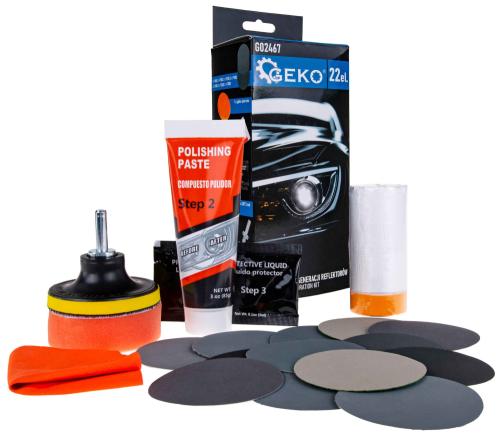 Táto kompletná sada obsahuje všetko, čo potrebujete na čistenie, leštenie a ochranu svetlometov krok za krokom, čím zabezpečíte profesionálne výsledky bez nákladnej cesty do garáže. Kompletná regenerácia: Odstraňuje matnosť, škrabance a žltnutie, čím obnovuje jasnosť svetlometov. Dlhotrvajúca ochrana: Ochranná kvapalina chráni pred UV žiarením a starnutím plastov. Urob si sám: Jednoduchý postup bez nutnosti návštevy dielne. Všestranné použitie: Sada je vhodná pre plastové svetlomety vo väčšine áut. Technické špecifikácie: Brúsny papiere 2 x P800, 2 x P1000, 2 x P1200, 2 x P1500, 2 x P2000, 2 x P2500, 2 x P3000 Sada na odstupňovanie umožňuje presné odstránenie nečistôt, žltnutia a mikroskopických škrabancov. Leštiaca špongia – na obnovenie dokonalej čistoty. Maskovacia páska (3 m x 1,5 cm) – chráni lak okolo svetlometu počas práce. Leštiaci kotúč so suchým zipsom – pre jednoduché upevnenie na adaptér. Závitový adaptér M10 – kompatibilný s väčšinou vŕtačiek a leštičiek. Mikrovláknová handrička – na nanášanie a konečnú úpravu. Leštiaca pasta (85 g) – kľúčový prvok leštiaceho procesu. 2 x 3 ml ochranná kvapalina – pre dlhodobú ochranu svetlometov pred UV žiarením a koróziou. Ako krok za krokom renovovať svetlomety? 1. Brúsenie: Navlhčite brúsny papier vodou a pripevnite ho na leštiaci kotúč. Prebrúste povrch svetlometu, začnite s najhrubšou zrnitosťou (P800) a postupne prejdite na jemnejšiu zrnitosť (P1200 -> P2000). Toto je nevyhnutné na úplné odstránenie žltnutia, vyblednutia a korózie. Poznámka: Brúsny papier používajte v poradí od najhrubšieho po najjemnejší. Vynechanie tohto kroku môže viesť k neúspešnej renovácii. 2. Leštenie Na leštiaci kotúč pripevnite leštiacu špongiu a naneste leštiacu pastu. Leštite svetlomet, kým nezíska späť svoj pôvodný lesk a čistotu. Poznámka: Pre dosiahnutie najlepších výsledkov použite elektrickú leštičku. Ak leštíte ručne, vykonajte aspoň 200 krúživých pohybov v smere hodinových ručičiek. 3. Ochrana: Pred nanesením ochrannej kvapaliny umyte svetlomet a uistite sa, že je suchý. Pracujte v tieni, mimo dosahu priameho slnečného žiarenia. Naneste 5-10 kvapiek ochrannej kvapaliny na handričku a rovnomerne ju rozotrite po svetlomete striedavými horizontálnymi a vertikálnymi pohybmi. Nechajte pôsobiť 3-5 minút a potom prebytočnú kvapalinu odstráňte. Počkajte 24 hodín na úplné vytvrdnutie alebo použite fén na 1-2 minúty.
