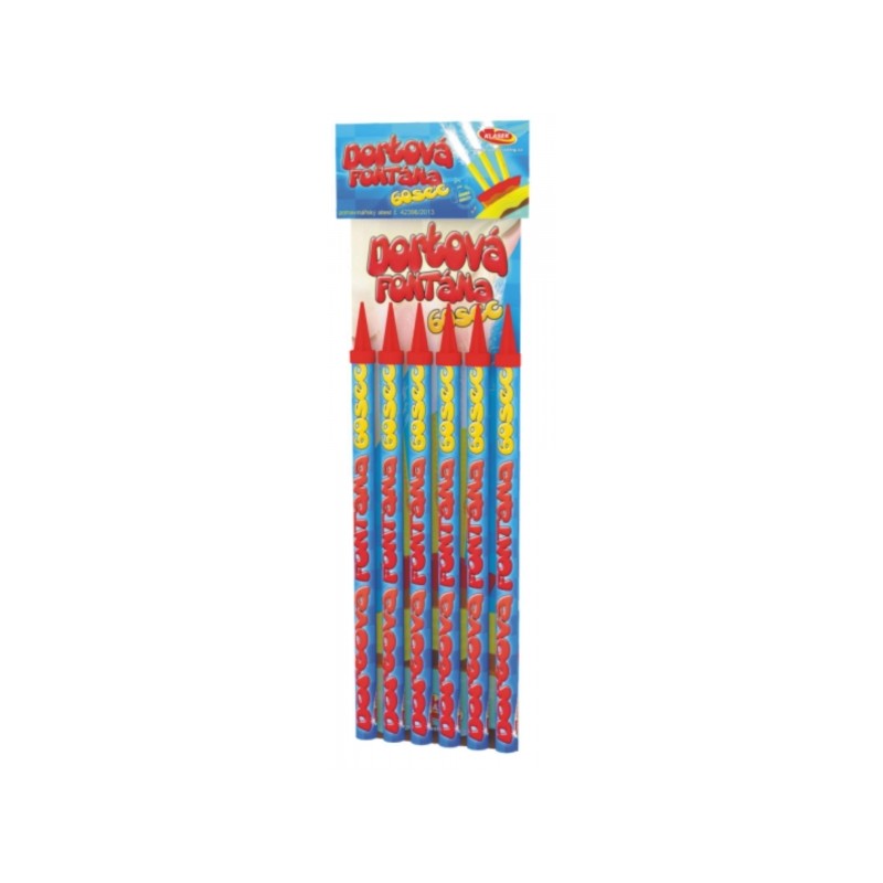Jedno balenie obsahuje 6 kusov interiérovej fontány na tortu dlhej 20 cm. Efekt tejto fontány je sprevádzaný striebornými hviezdičkami po dobu 60 sekúnd. Fontána je lepená potravinárskym atestom, takže je bezpečná na použitie s potravinami.