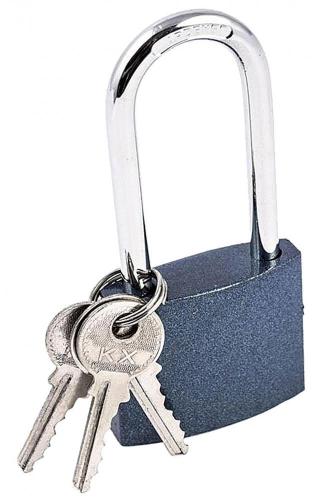 Liatinové zámky AB s dlhým závesom. Teleso je pokryté kovovým lakom. Obsahuje 3 kľúče. Má oceľový, kalený záves. Balené na blistri alebo v škatuliach po 6 kusoch. Visiace zámky posielame v rôznych farbách (modrá, červená a zlatá).